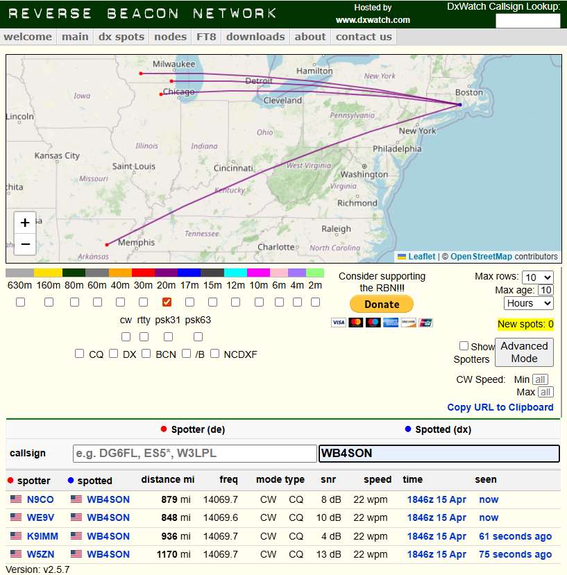 Conditions weren’t great today on 20m. Lots of slow deep fades. Nevertheless four stations picked me up on the RBN – not a booming signal, of course, but not bad for 4 watts.